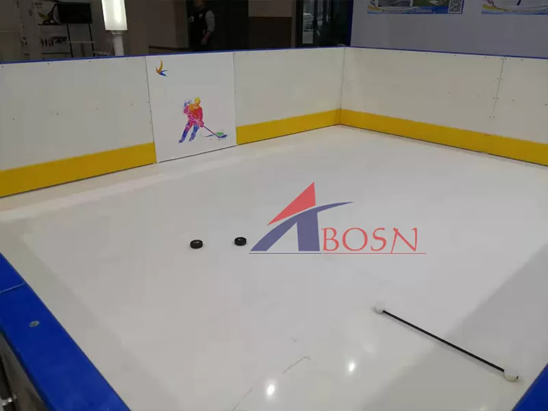 The handrail board is a polyethylene PE board with a thickness of 15mm. The inner and outer corners of the ice rink need to be rounded, and the color is blue.